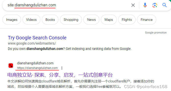 来检验你的网站是否已经被收录,比如我这里输入site:dianshangdulizhan.com,能在搜索出你的网站则表明已成功收录。