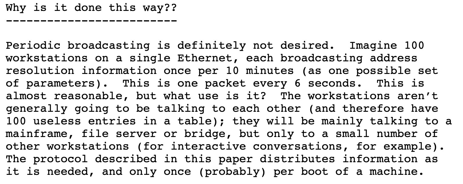 为什么不用定期广播的形式寻址呢,可以但没必要,主机通常并不会相互交流,只有在有需要时通信,所以只要在通信前寻址一次,然后缓存到自己的ARP缓存表,那么短时间内的连续通信就可以不用再发送ARP请求了