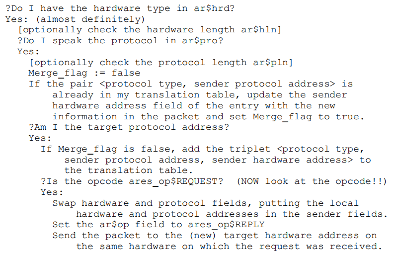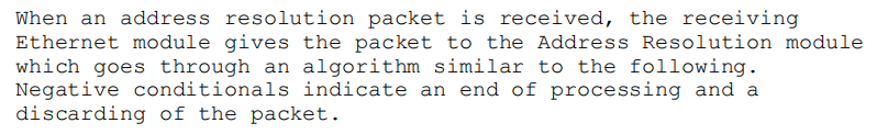 当收到地址解析数据包时,接收以太网模块将数据包交给地址解析模块,该模块通过类似于以下的算法。否定条件表示处理结束并丢弃数据包