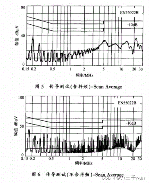 一般来说,采用抖频技术时,由于将离散的频谱分布在一定的频带内,从而使得频谱在一些频段内趋于连续,所以EMI测试曲线在高频段幅值低并且变得光滑,从而辐射即使要求6dB的工程裕量也很容易通过,从上面 EMI传导辐射测试曲线比较中可以明显看出,采用抖频技术减小 EMI的效果很明显。与传统的抑制EMI的方法相比,频率抖动技术采用功率半导体集成芯片内部电路来改善EMI,可以考虑用体积小的滤波器,节省成本。下面是从《抖频--有效降低开关电源EMI噪声容限的技术》论文中截取的两张频谱对比图。可见EMI明显改善。