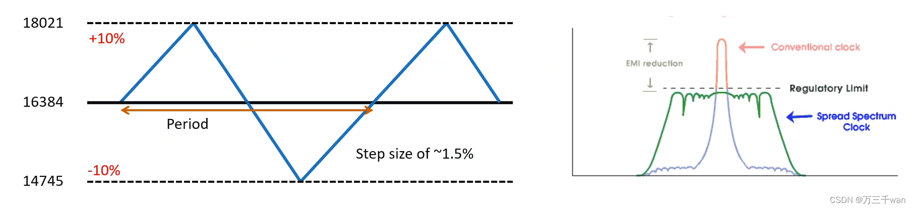 下图(左)是常使用的频率线性变化范围,为固定频率(16384)的+/-10%,这个范围也是抖频中常使用的范围,一般在这个范围之内均可。工程调试过程中常用+/-6 or -7%.