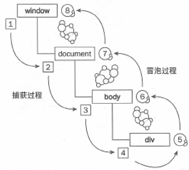 当一个事件发生时,它会先从浏览器顶级对象Window一路向下传递,一直传递到触发这个事件的那个元素,这也就是事件捕获(event capturing)过程。然而,一切并没有结束,事件又从这个元素一路向上传递到Window对象,这也就是事件冒泡(event bubble)过程(但是在IE8以及其之前版本中,事件模型并未定义捕获过程,只有冒泡过程)。