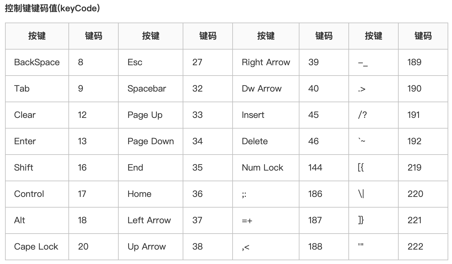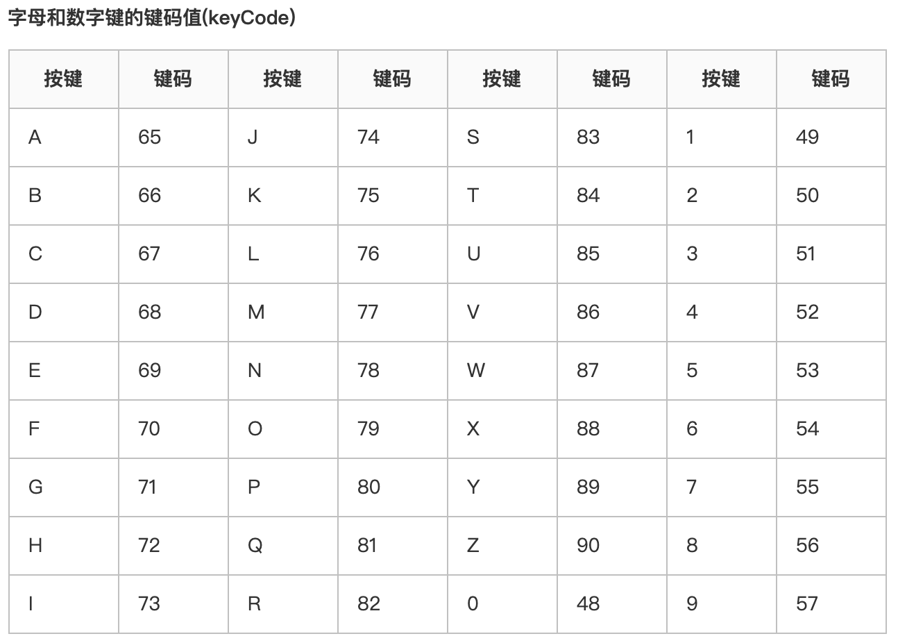 当触发keydown和keyup事件时,其event对象有个叫做 keyCode 的属性,其包含了用户所按下的按键的字符键码。例如:字符“q”对应的键码为81,字符"w"对应的键码是87。 注: keyCode属性不会区分字符大小写状态的 ,例如:不管是大写A还是小写a均返回65。