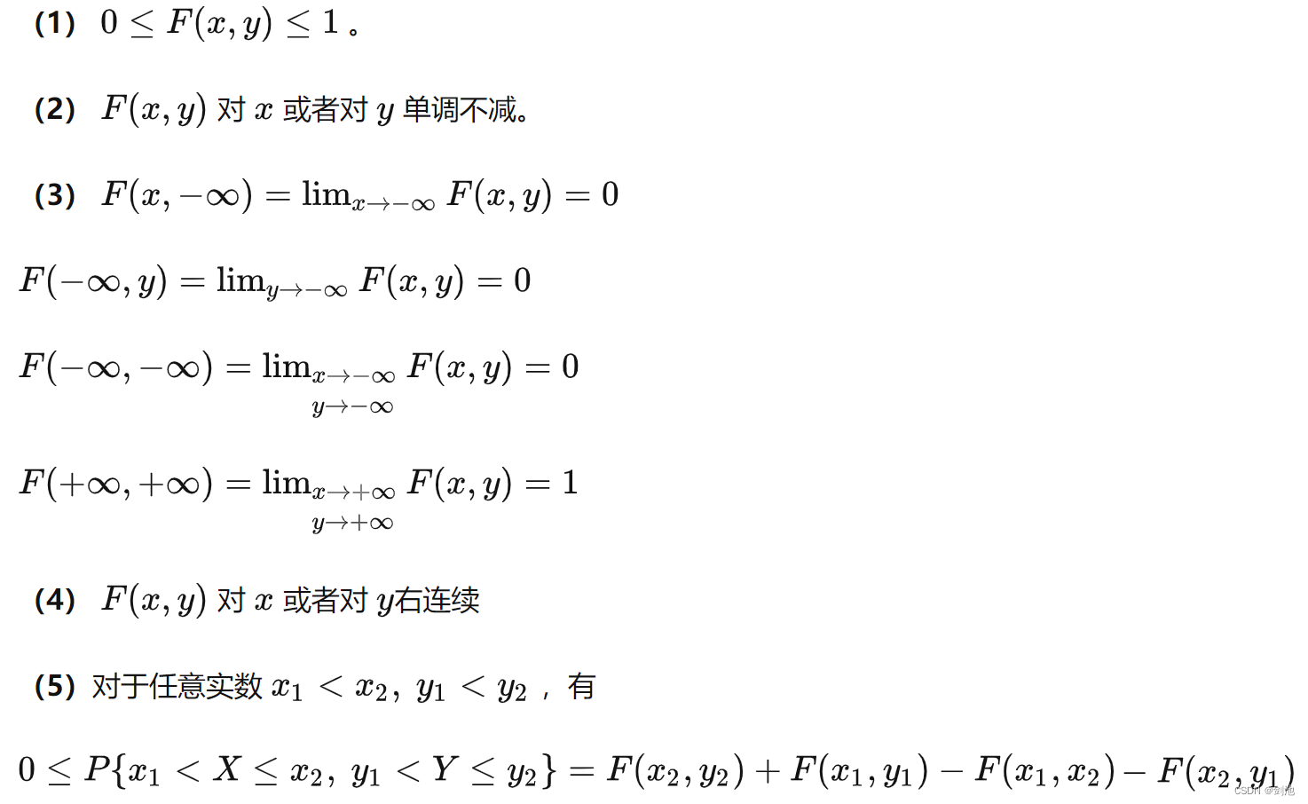 二维随机变量分布函数具有下列五条基本性质: