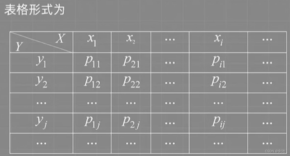 记 P{X=xi,Y=yi}=pij, i,j=1,2,… ,则称它为二维离散型随机变量 (X,Y) 的(概率)分布律,或者称为 X 和 Y 的联合(概率)分布律。
