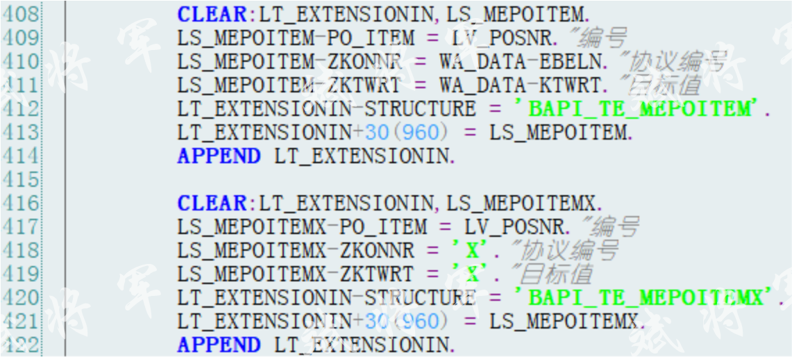 * lt_POITEM-CONF_CTRL = ''."BSTAE."确认控制代码APPEND lt_poitem.CLEAR:LT_EXTENSIONIN,LS_MEPOITEM.LS_MEPOITEM-PO_ITEM = LV_POSNR."编号LS_MEPOITEM-ZKONNR = WA_DATA-EBELN."协议编号LS_MEPOITEM-ZKTWRT = WA_DATA-KTWRT."目标值LT_EXTENSIONIN-STRUCTURE = 'BAPI_TE_MEPOITEM'.LT_EXTENSIONIN+30(960) = LS_MEPOITEM.APPEND LT_EXTENSIONIN.CLEAR:LT_EXTENSIONIN,LS_MEPOITEMX.LS_MEPOITEMX-PO_ITEM = LV_POSNR."编号LS_MEPOITEMX-ZKONNR = 'X'."协议编号LS_MEPOITEMX-ZKTWRT = 'X'."目标值LT_EXTENSIONIN-STRUCTURE = 'BAPI_TE_MEPOITEMX'.LT_EXTENSIONIN+30(960) = LS_MEPOITEMX.APPEND LT_EXTENSIONIN.lt_poitemx-po_item = lv_posnr.lt_poitemx-ematerial = abap_true.lt_poitemx-short_text = abap_true.lt_poitemx-quantity = abap_true.lt_poitemx-po_unit = abap_true .lt_poitemx-net_price = abap_true.IF i_bsart = 'YG05'."成本中心lt_poitemx-matl_group = abap_true.ENDIF.lt_poitemx-plant = abap_true.lt_poitemx-acctasscat = abap_true.