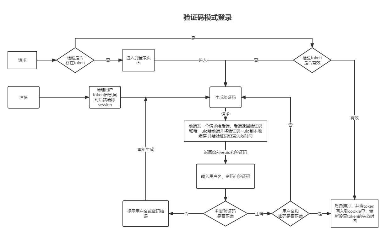 7. 注销登录。前端发起注销登录请求, 清除当前用户的token缓存信息,后端同时清除掉session, 前端重新发起请求,刷新登录页面的验证码。