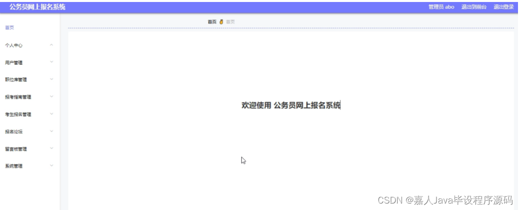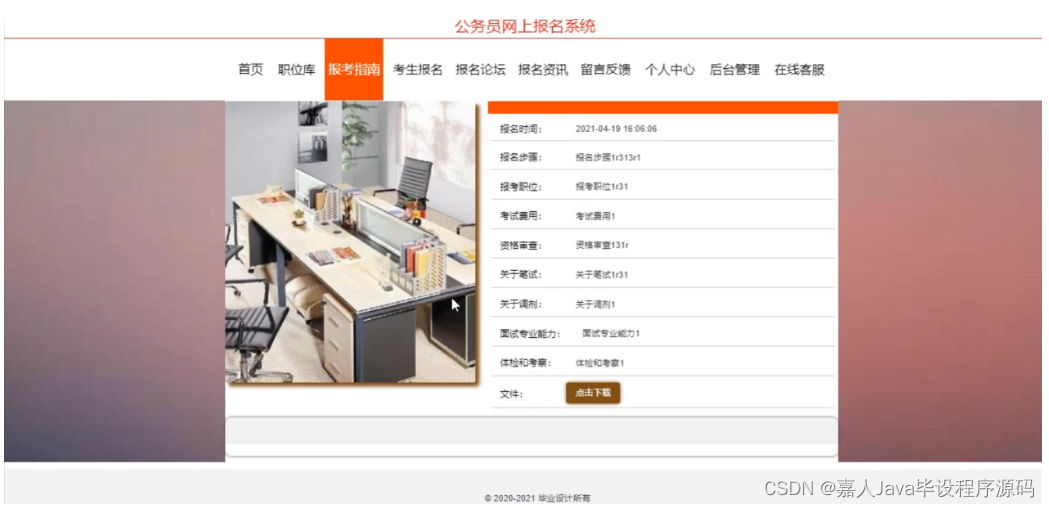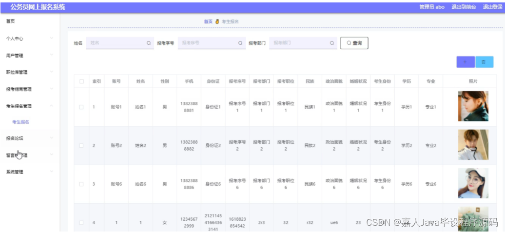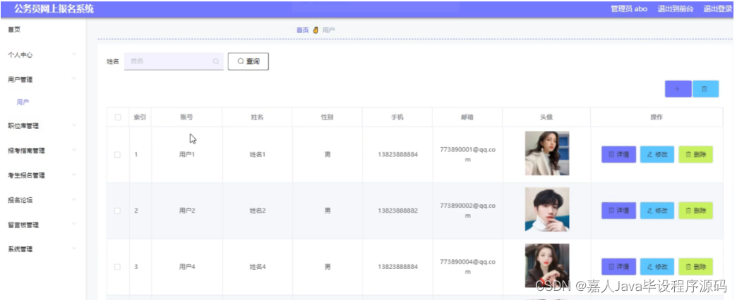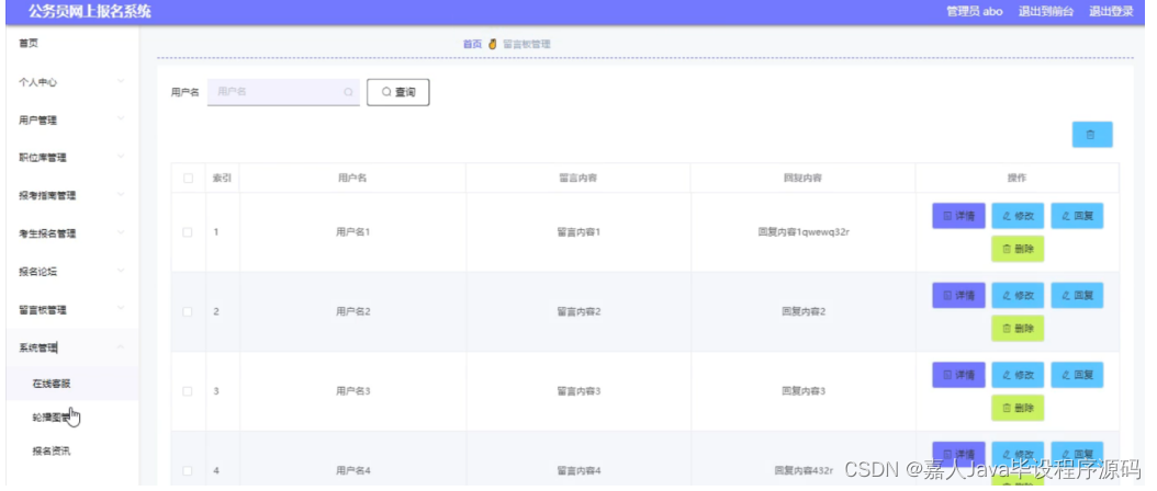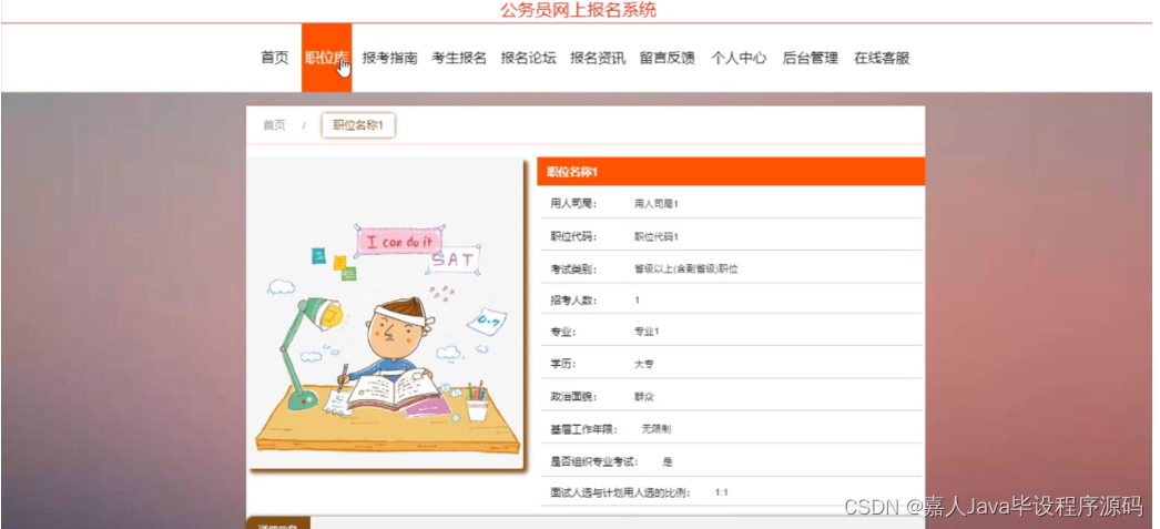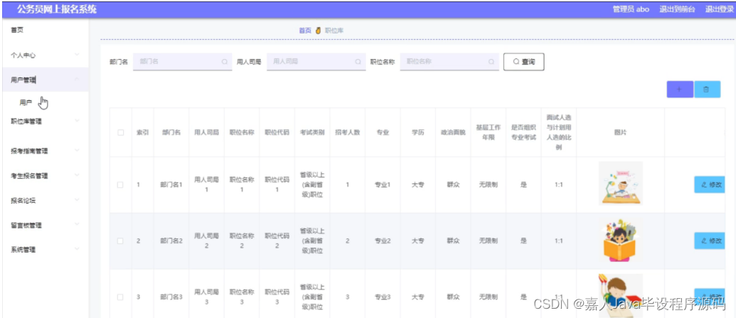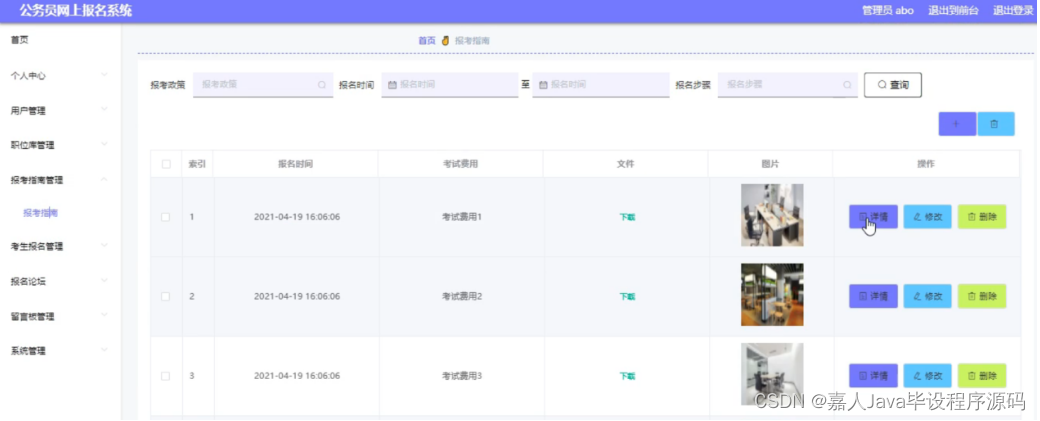 3、功能的完善性:可以管理首页、个人中心、用户管理、职位库管理、报考指南管理、考生报名管理、报名论坛、留言板管理、系统管理模块的修改维护操作。