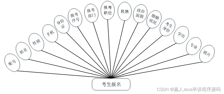 通过公务员网上报名系统的功能进行规划分成几个实体信息,实体信息将通过ER图进行说明,本系统的主要实体图如下:
