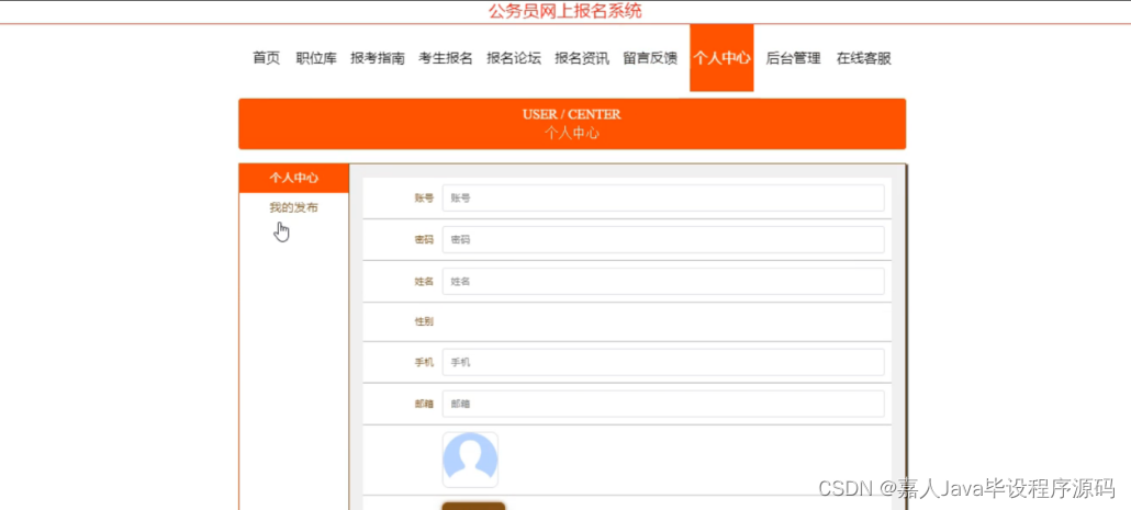 个人中心,在个人中心页面通过填写账号、密码、姓名、性别、手机、邮箱、上传图片等信息进行更新信息,根据需要对我的发布进行详细操作,如图5-6所示。