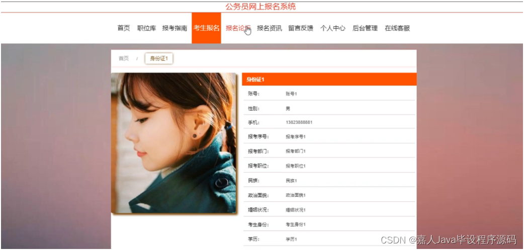 考生报名,在考生报名页面可以查看账号、姓名、性别、手机、身份证、报考序号、报考部门、报考职位、民族、政治面貌、婚姻状况、考生身份、学历、专业、照片等详细内容,如图5-4所示。