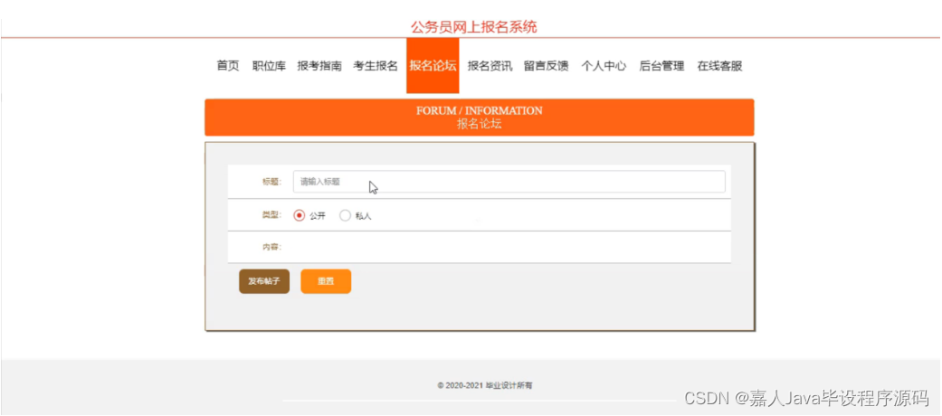 报名论坛,在报名论坛页面输入标题、类型、内容等内容进行发布帖子或重置操作,如图5-5所示。