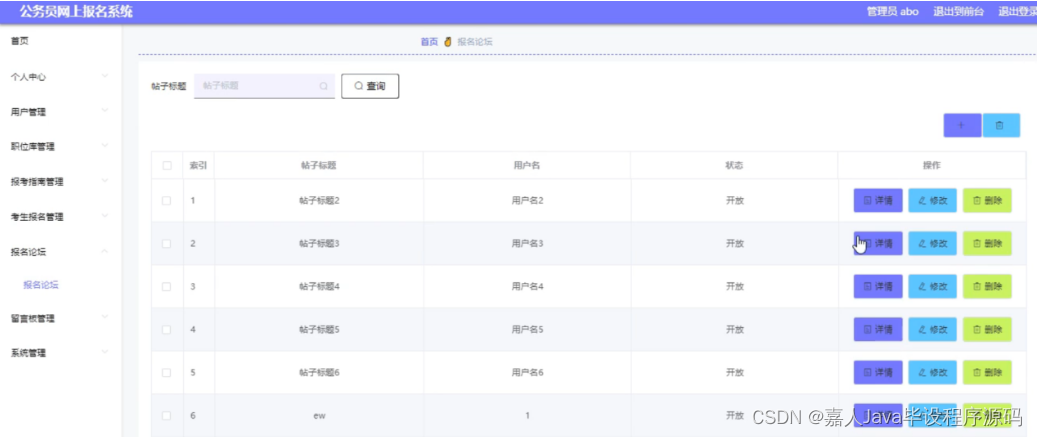 报名论坛,在报名论坛页面可以对索引、帖子标题、用户名、状态等内容进行详情,修改或删除等操作,如图5-13所示。