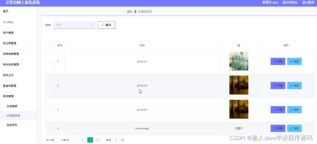 系统管理,在轮播图管理页面可以对索引、名称、值等内容进行详情,修改等操作,还可对在线客服、报名资讯进行相应操作,如图5-15所示。