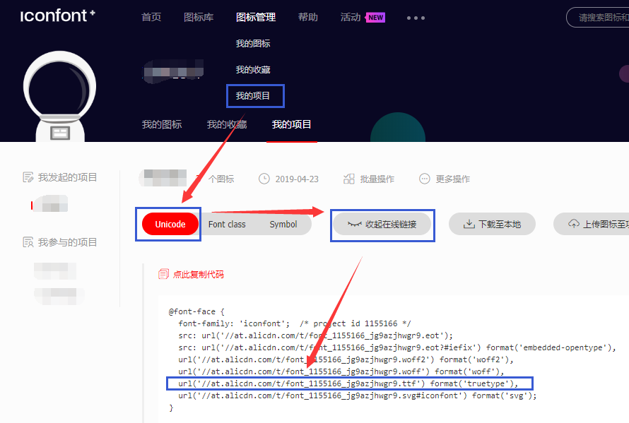 - 把需要的icon加入在自己项目中,在自己的iconfont项目中选择Unicode,点击查看在线链接,如上图所示