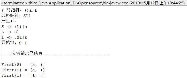 public class WenFa {char BeginSymbol; //文法的开始符StringBuffer terminator; //终结符StringBuffer nonterminator; //非终结符ArrayList<startNode> production; //文法产生式存储入口WenFa(){terminator = new StringBuffer("");nonterminator = new StringBuffer("");}}
