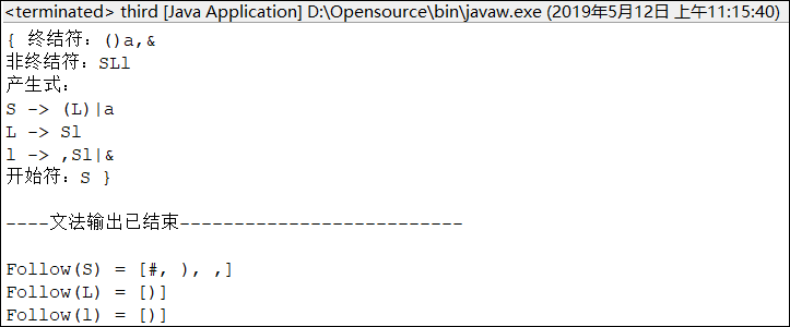 //求一个非终结符的follow集public HashSet getFollowCollection(char C){HashSet followSet = new HashSet(); //定义follow集//是开始符号if(C==BeginSymbol)followSet.add('#');for(startNode startnode : production){ //遍历非终结符Node node = startnode.next;while(node!=null){//1当前字符与C匹配成功if(node.val==C){ //1.1当前字符不在产生式末端if(node.next1!=null){//1.1.1下一个字符是终结符if(isTerminator(node.next1.val)==true){followSet.add(node.next1.val); //情况1:将后一个终结符字符加入//转下一个产生式while(node.next1!=null){node=node.next1;}node = node.next2;}//1.1.2下一个字符是非终结符else{ //System.out.println("getFirstCollection of "+node.next1.val+" = "+getFirstCollection(node.next1.val));//====followSet.addAll(getFirstCollection(node.next1.val)); //加入非终结符的First集if(getFirstCollection(node.next1.val).contains('&')) //如果此非终结符可推出空followSet.addAll(getFollowCollection(node.next1.val)); //加入Follow集while(node.next1!=null){node=node.next1;}node = node.next2;}}//1.2当前字符在产生式末端else{if(C!=startnode.val){ //此判断避免陷入无限递归//System.out.println("getFollowCollection of "+startnode.val+" = "+getFollowCollection(startnode.val));//====followSet.addAll(getFollowCollection(startnode.val));}node = node.next2;}}//2当前字符与C未匹配成功else{ if(node.next1!=null) //检验下一个字符node = node.next1;else //检验下一个产生式node = node.next2;}//System.out.println(followSet);} }followSet.remove('&'); //集合去空(空用‘&’表示)return followSet;}
