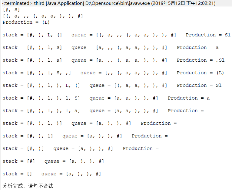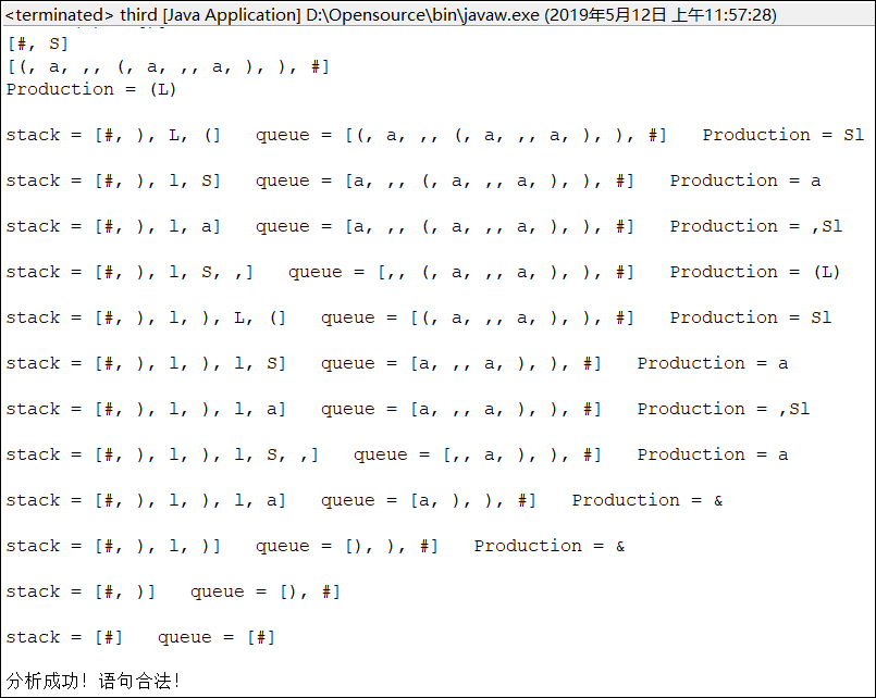 //对输入串进行语法分析public void AnalyseSentence(StringBuffer inputSen){LinkedList queue = new LinkedList(); //输入串队列for(char c : inputSen.toString().toCharArray()){queue.add(c);}int analyseFlag = 0; //文法分析循环标志Stack stack = new Stack(); //符号栈stack.push('#'); //'#'进栈 stack.push(BeginSymbol); //文法开始符进栈System.out.println(stack);System.out.println(queue);while(analyseFlag == 0){char c1 = (char) stack.pop(); //出栈char c2 = (char) queue.getFirst(); //获取队列首元素if(c1=='#'){if(c1==c2){analyseFlag = 1; //分析成功stack.push('#'); //多余一步,为了输出方便观察break;}else{analyseFlag = -1; //分析失败,出现错误break;}}if(c1==c2){queue.pollFirst(); //首元素出队列}//c1!=c2,产生式入栈else{String str = searchProduction(c1,c2).toString();System.out.println("Production = "+str+"\n");if(str!=null){char[] array = str.toCharArray();for(int i=array.length-1;i>=0;i--){stack.push(array[i]); //产生式倒序入栈}if(array.length==1){if(array[0]=='&')stack.pop(); //空字出栈}System.out.print("stack = "+stack+" ");System.out.print("queue = "+queue+" ");}elseanalyseFlag = -1; //出现错误}}System.out.println("\n\nstack = "+stack+" queue = "+queue);switch(analyseFlag){case 1:System.out.println("\n分析成功!语句合法!");break;case 0:System.out.println("\n分析失败...");break;default:System.out.println("\n分析完成,语句不合法");}}
