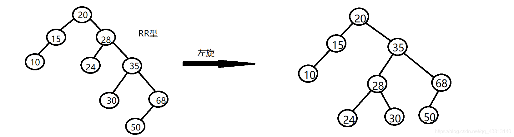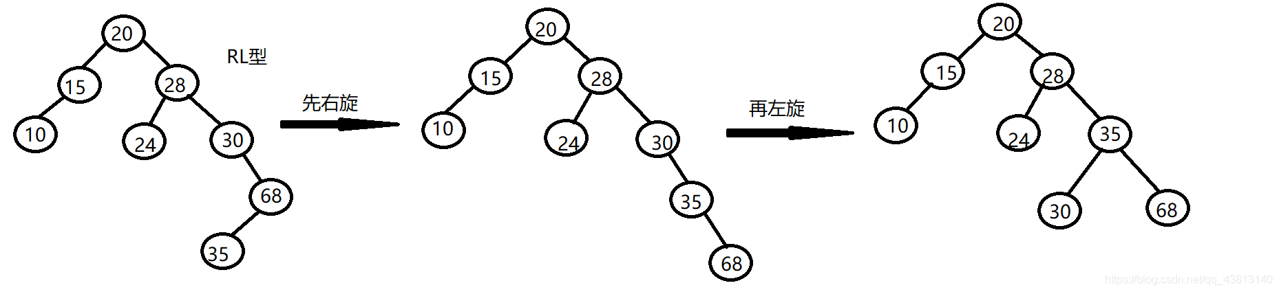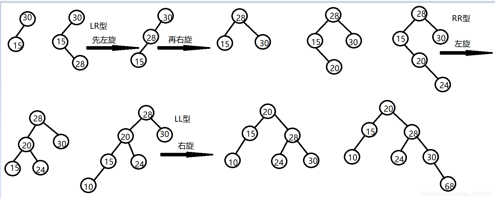依次输入表(30,15,28,20,24,10,68,35,50)中的元素,生成一棵平衡的二叉排序树。请画出构造过程,并在其中注明每一次平衡化的类型(LL型、RR型、LR型、RL型)
