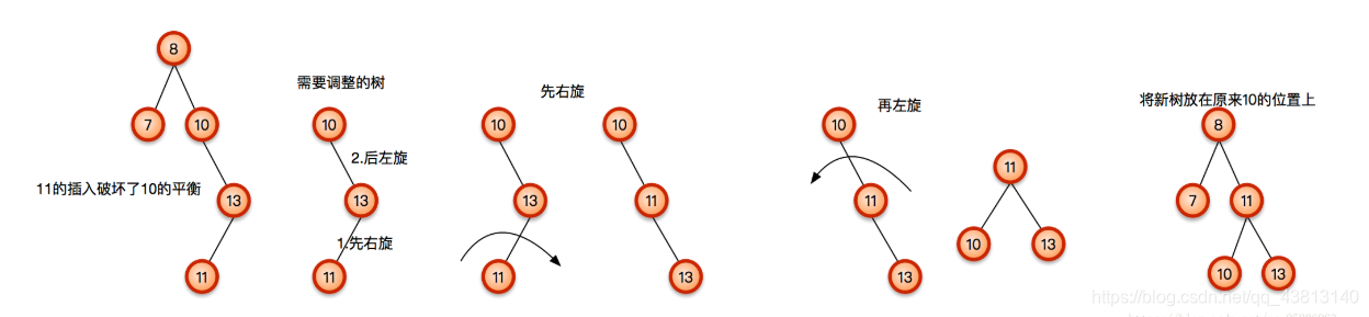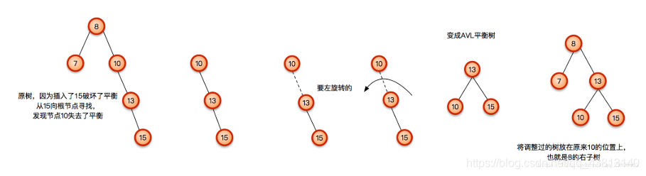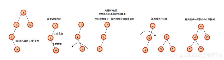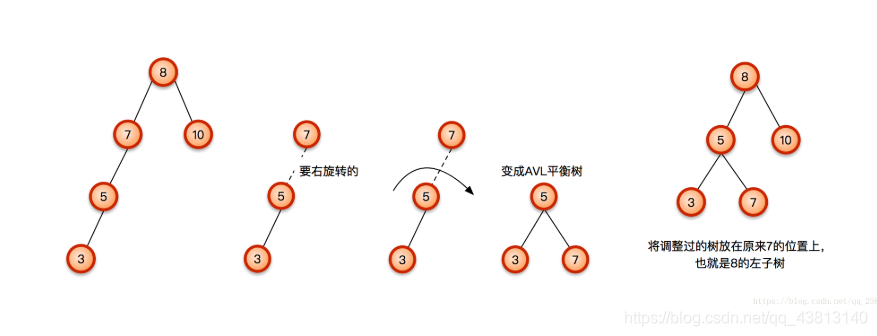 因为左子树5的高度更高,所以要把左子树5向上提一下,这时旋转就很明显了,抓着5向上一提,7就掉到5的右边了,成了5的右子树。