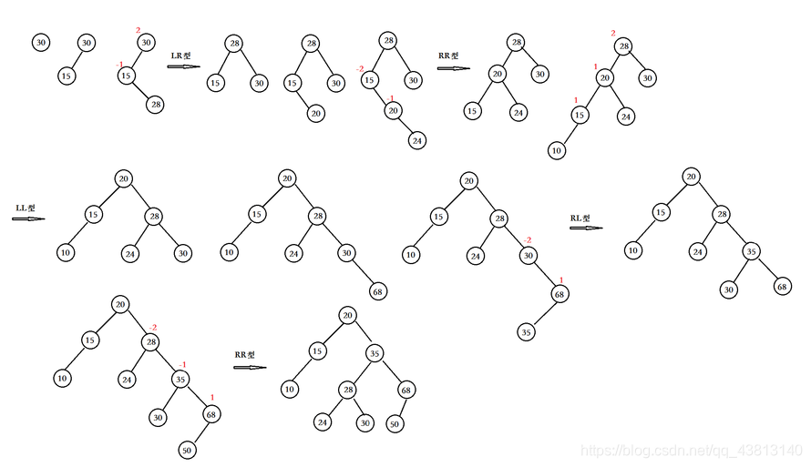 数据结构:平衡树-依次输入表(30,15,28,20,24,10,68,35,50)中的元素,生成一棵平衡的二叉排序树。请画出构造过程,并在其中注明每一次平衡化的类型(LL型、RR型、LR型、RL型)