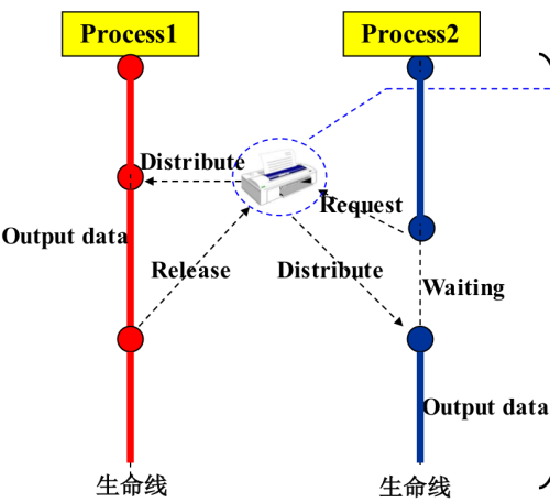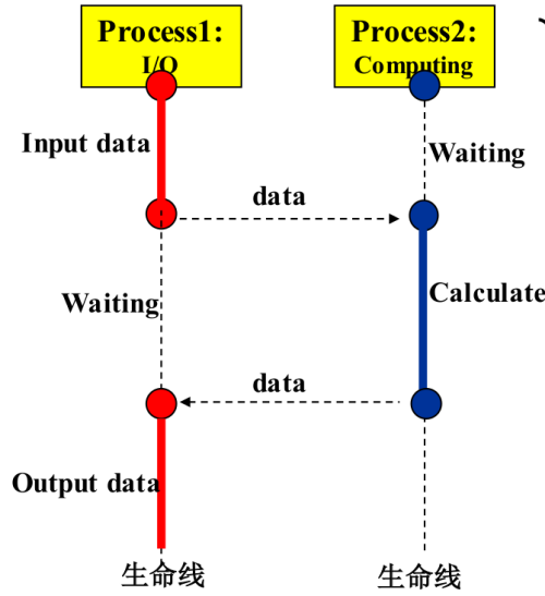 如图所示:一个进程在执行操作的时候,另一个进程必须等待,体现在次序上的等待和协调,并不争夺临界资源。