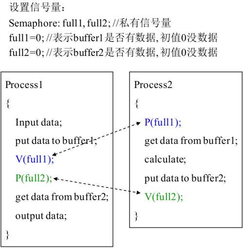 这里主要体现了进程的同步。如有疑问,请看信号量介绍的同步实现。