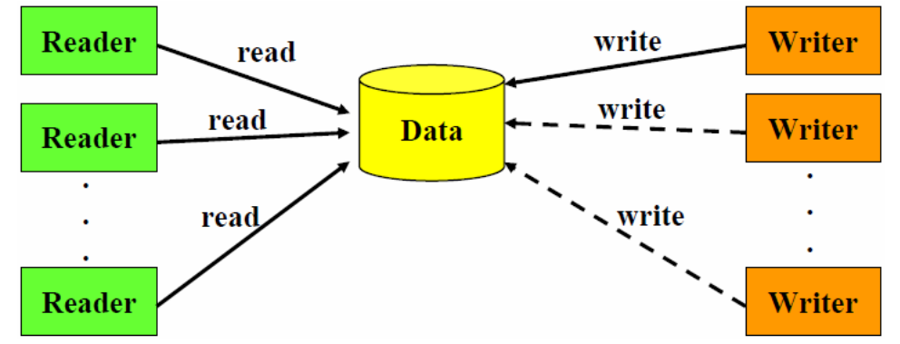 描述:一个数据对象(文件、记录)可以为多个并发进程共享。其中有的进程只需要读其中的内容,我们称为“读者”;有的进程负责更新(读写)其中内容,我们称为“写者”。