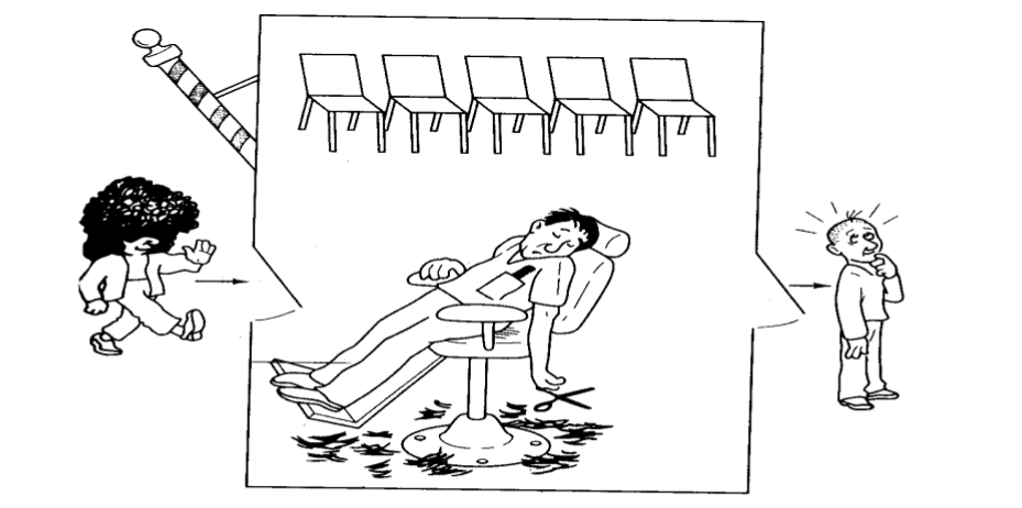 Ø理发师行为:睡觉、理发。没有顾客睡觉,有顾客理发。