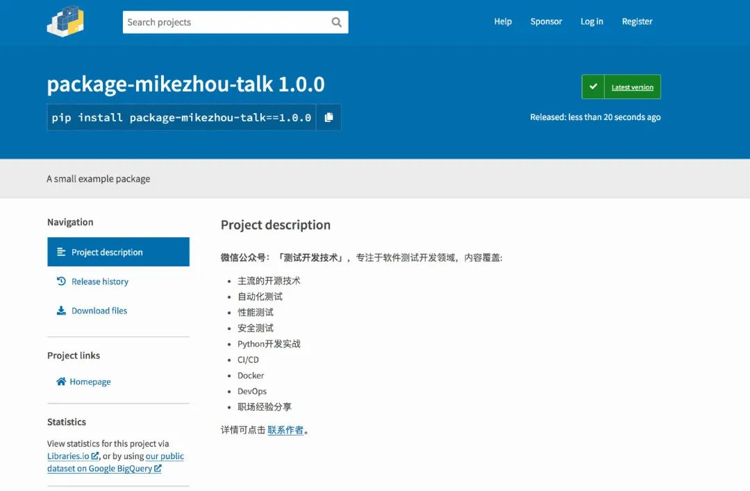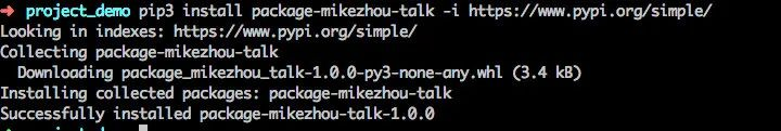 至此,我们已经成功地将自己开发的Python程序发布到了PyPI,此时你,可以直接在你本地的环境通过pip命令安装示例中的package-mikezhou-talk这个包了。
