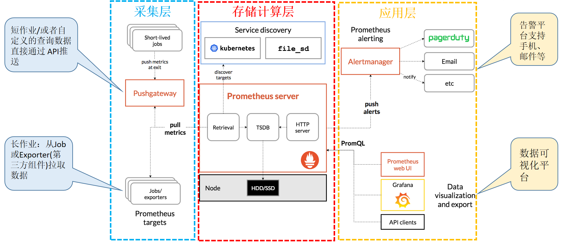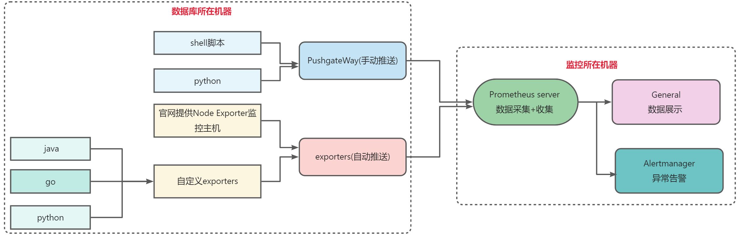 prometheus --> 触发阈值 --> 超出持续时间 --> alertmanager --> 分组|抑制|静默 --> 媒介类型 --> 邮件|钉钉|微信等