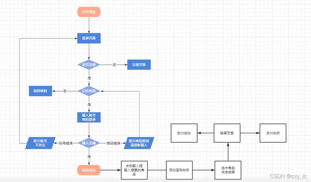 场景二:打开淘宝登录账号登陆成功,点击输入框找到商品,添加至购物车,选中商品点击结算到结算页面,点击支付输入支付密码,支付失败