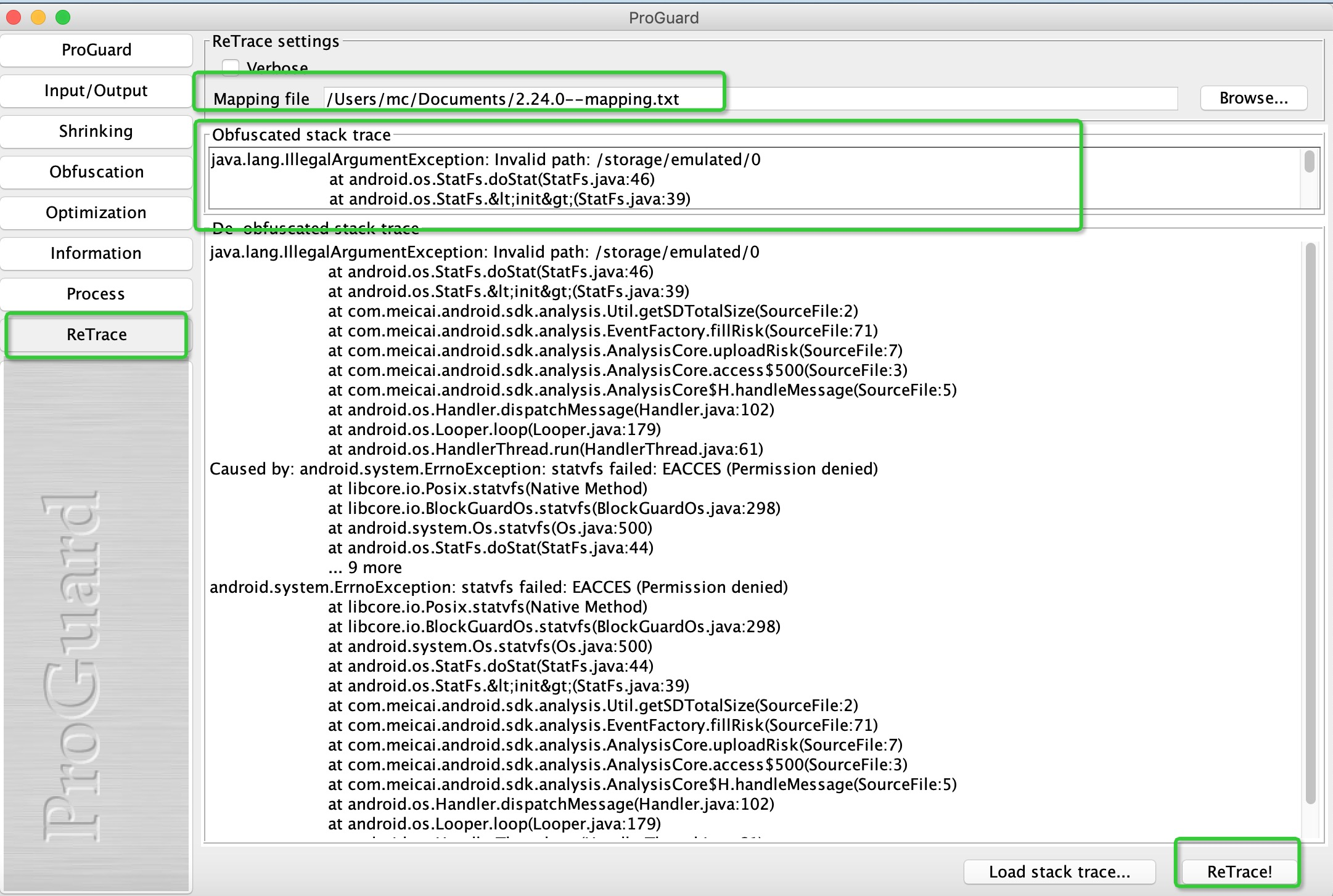 3、打开proguardgui工具,ReTrace选项,Mapping file中添加mapping文件,