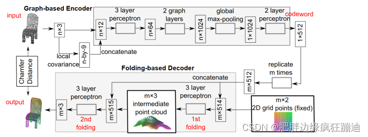 Decoder的结构:首先将Encoder得到的codeword重复 m m m 次得到大小为 m × 512 m\times512 m×512 的矩阵,并将该矩阵与 m × 2 m\times2 m×2 的矩阵(表示点云个数为 m m m 的2D grid,可以理解为初始的重建点云)进行串联,得到大小为 m × 514 m\times514 m×514 的矩阵;然后将上面 m × 514 m\times514 m×514 的矩阵喂给一个3层MLP,输出一个大小为 m × 3 m\times3 m×3 的矩阵(表示第一次folding后重建的点云);然后将上面 m × 3 m\times3 m×3 的矩阵和 m × 512 m\times512 m×512 的矩阵(重复的codeword)串联为大小为 m × 515 m\times515 m×515 的矩阵,并将其喂给一个3层MLP,输出就是重建的点云。总结,就是将Encoder得到的特征和需要变形的点云串联得到新的特征,输入给3层感知机;如此重复两次,得到重建的点云。
