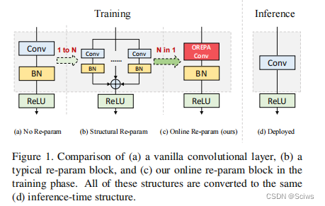 在受益于复杂的training-time拓扑,同时,当前的重参化方法训练使用不可忽略的额外计算成本。当块变得更复杂以变得更强的表示时,GPU内存利用率和训练时间将会越来越长,最终走向不可接受。与以往的重参化方法不同,本文更多地关注训练成本。提出了一种通用的在线卷积重参化策略,使training-time的结构重参化成为可能。