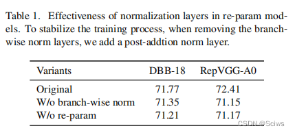 作者认为中间BN层是重参化过程中多层和多分支结构的关键组成部分。以SoTA模型DBB和RepVGG为例,去除这些层会导致严重的性能下降,甚至较深模型中会出现梯度消失。现象如表1所示。