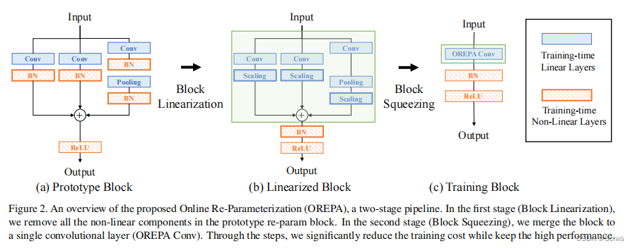 基于观察结果,作者提出了在线重参化(OREPA)(图1(c)),这是一个两阶段的pipeline,使之能够简化复杂的training-time re-param block。