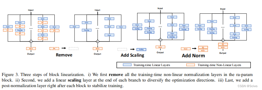 基于线性缩放层,作者修改了重参化块,如图3所示。具体来说,块的线性化阶段由以下3个步骤组成: