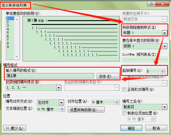 b.选择 "定义新的多级列表", 并进行如下图所示的设置,之后点击"确定":