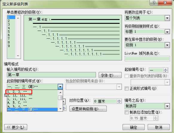a.右击标题一,也就是图中的"第一章",选择"调整列表缩进",在"编号样式"中选择图示样式,如下图所示,然后点击"确定"