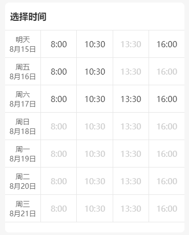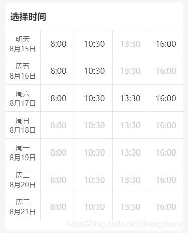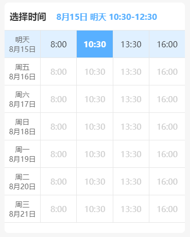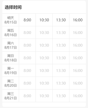 【微信小程序】微信小程序实现未来一周时间表,时间表中显示时间段和是否可以预约或使用