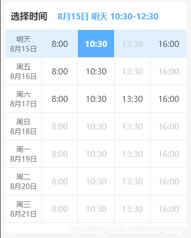 点击某一个时间段该行会变成浅蓝色,该时间段会变成深蓝色,字体颜色变成白色,字体变粗,这些可以通过动态改变样式来实现