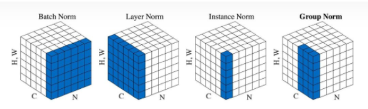 上边这张图显示了四种标准化的方向,其中C轴表示通道,N轴表示Batch中的样本序号,H、W轴可以认为是图像样本中的宽和高。