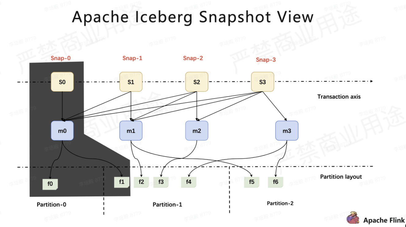 snapshot是iceberg比较重要的概念。Iceberg 基于MVCC(Multi-Version Concurrency Control)设计,每次commit都会生成一个快照(Snapshot),该快照包含唯一的snapshotId、时间戳timestamp及对应的manifest文件。