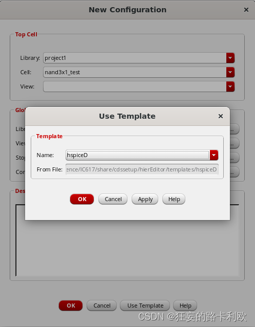 点击OK,会弹出一个界面。view那里选择schematic,然后点击下面的use Template这里,在弹出的界面选中hspiceD,然后OK下一步。