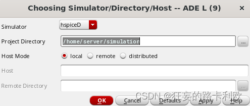 一般来说virtuoso仿真时会默认调用自家的spectre仿真器,如果大家用的PDK里有提供spectre的仿真模型,就不用hspice来仿真啦。至于我为什么要用?当然是因为我的工艺库里没有这个模型,只有hspice的模型。换仿真器在上面这个界面的setup-->Simulator/Directory/Host选项里,选中HspiceD这个仿真器,然后OK,virtuoso会重新加载这个仿真窗口。