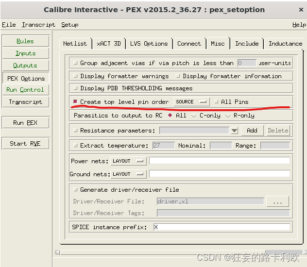 接下来是很关键的一步,也是很多人最容易忽视的地方。首先在Setup里选中PEX options选项,打开PEX的设置。然后在Misc选项栏下,选中“Create top level pin order”选项,然后把右边改为SOURCE。不选中这一项的话,生成的PEX网表,pin脚是乱的,导致后仿真错误。
