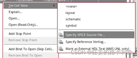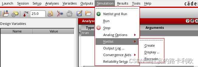 接下来的步骤就和前仿真一致了。注意仿真模型那里默认是AMS,改成HspiceD。在进行仿真前,可以先看一下网表确认一下,在Simulation-netlist-create,点击查看生成的网表文件: