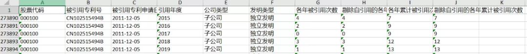 4)为了展现上市公司每个专利被引用的详细情况,整理得到“申请(授权)专利的被引用信息”数据集。