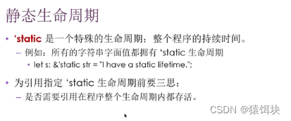 Rust中可以用static关键字声明静态变量。如下所示:let语句一样,static语句同样也是一个模式匹配。与let语句不同的是,用static声明的变量的生命周期是整个程序,从启动到退出。static变量的生命周期永远是’static,它占用的内存空间也不会在执行过程中回收。这也是Rust中唯一的声明全局变量的方法,注意,局部static作用域在局部。